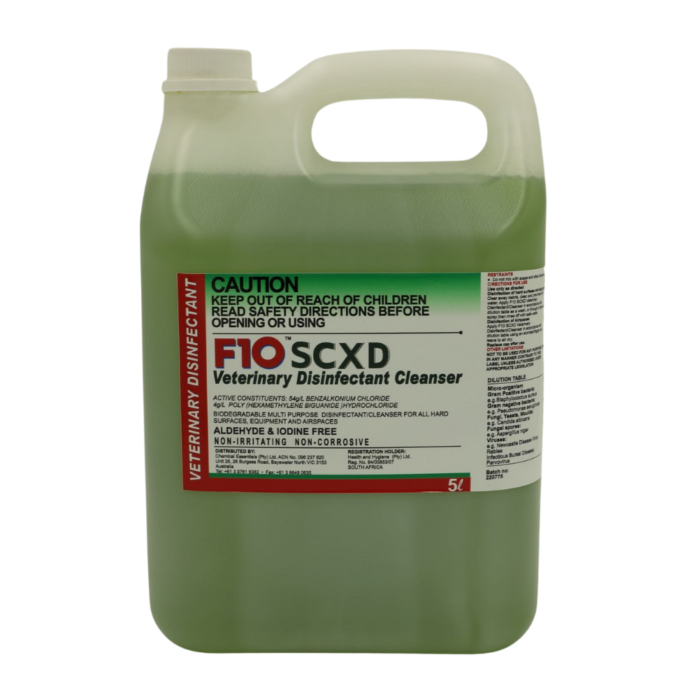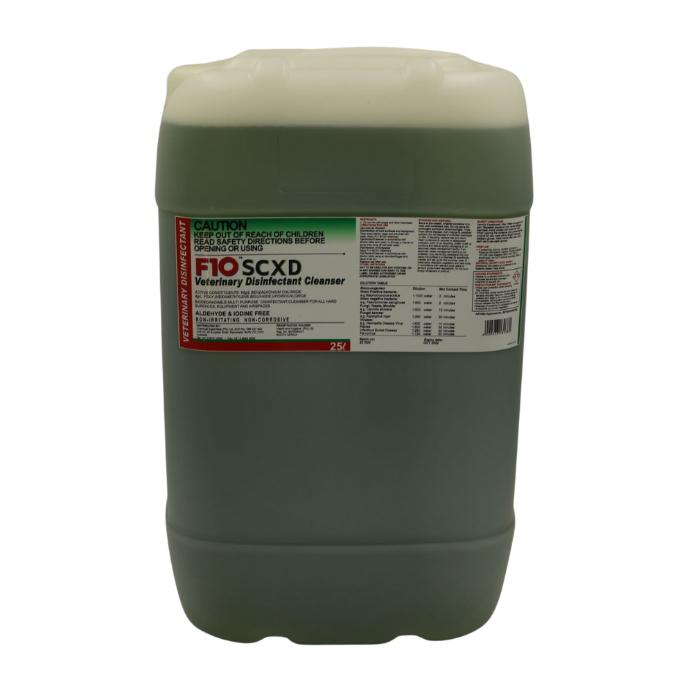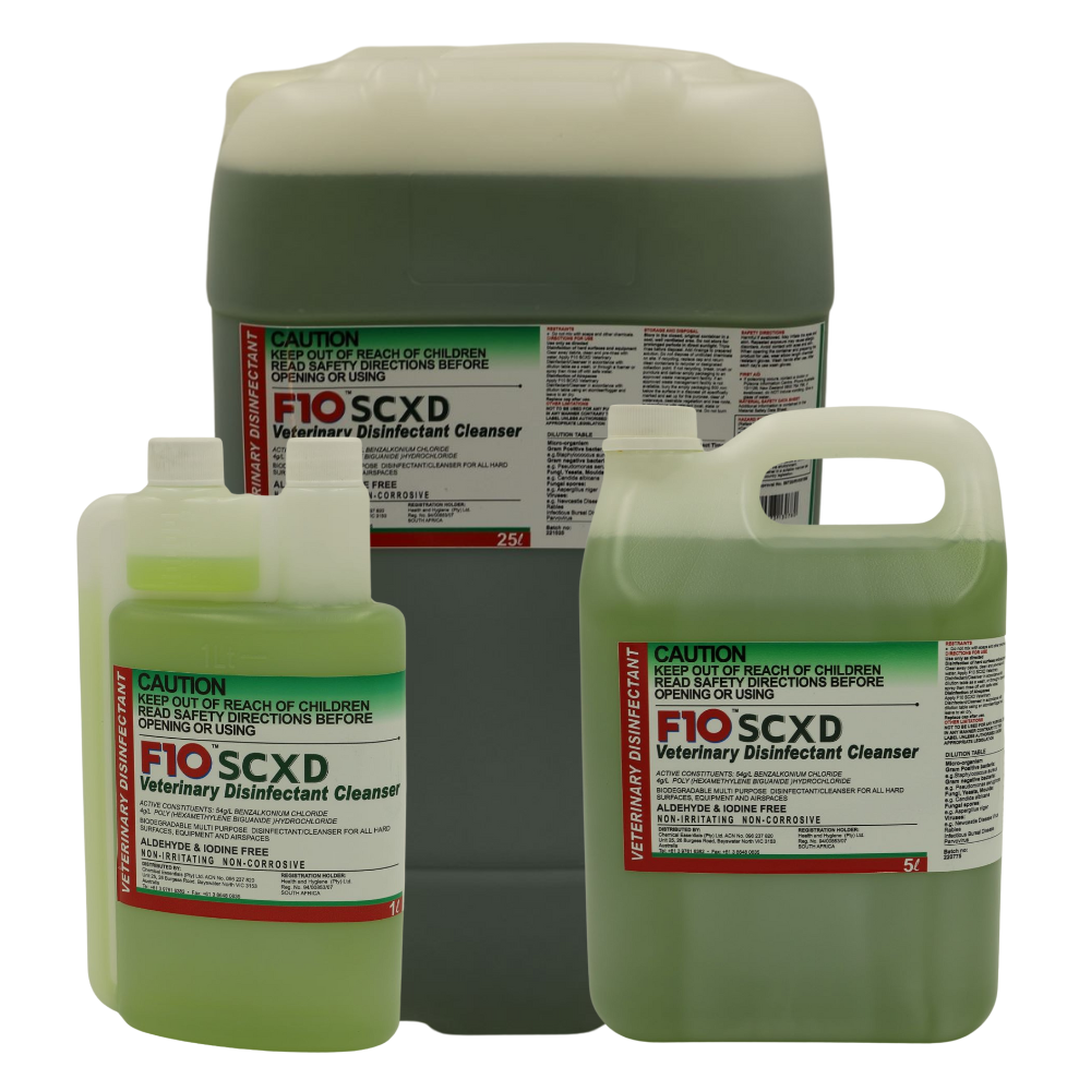 F10SCXD is the same as F10 SC Veterinary Disinfectant in terms of pathogen killing performance, but contains additional surfactants that allow the one-step cleaning and disinfection of lightly soiled surfaces that may be necessary in certain instances.